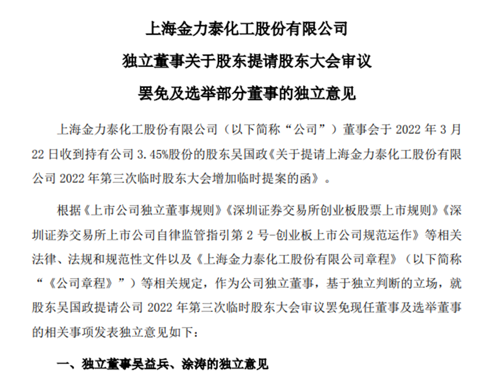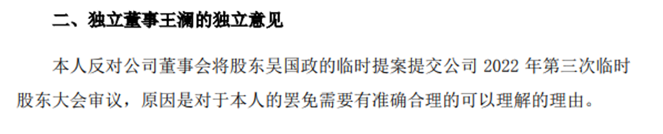 而独立董事王澜的独立意见是,本人反对公司董事会将股东吴国政的临时提案提交公司 2022 年第三次临时股东大会审议,原因是对于本人的罢免需要有准确合理的可以理解的理由。