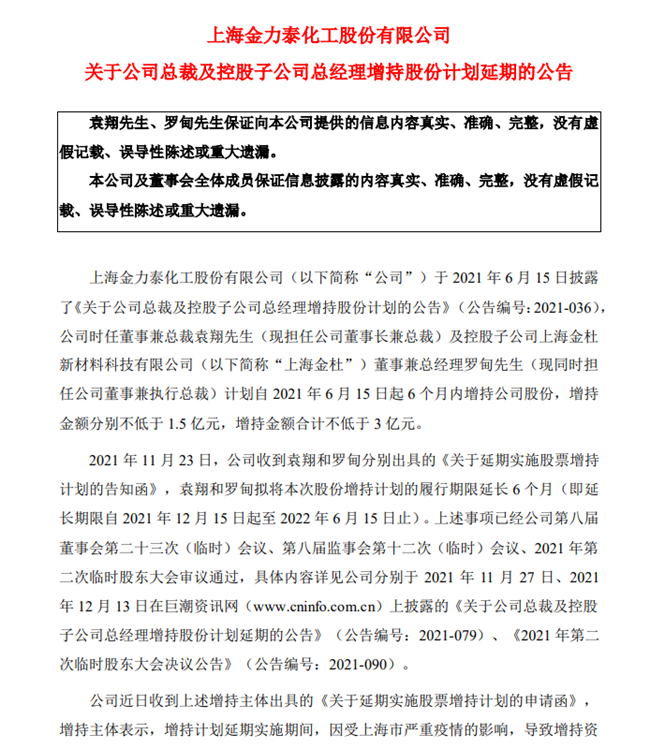 然而,增持期已经过了一半,袁翔、罗甸均尚未增持公司股份。中外涂料网注意到,据金力泰2022年5月27日的公告,公司近日收到上述增持主体出具的《关于延期实施股票增持计划的申请函》,增持主体表示,增持计划延期实施期间,因受上海市严重疫情的影响,导致增持资金未能及时筹措到位,预计无法在 2022年6月15日前完成本次增持计划,现申请将上述增持计划的履行截止日由2022年6月15日延至 2022年9月30日。