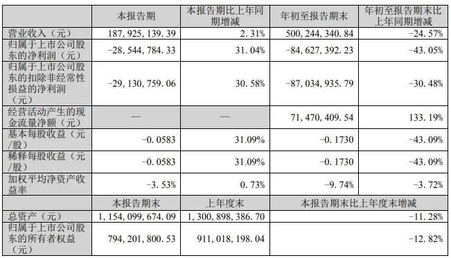 其中,第三季度营业收入1.88亿元,同比增长2.31%;归属于上市公司股东的净利润-2854.78万元,同比增长31.04%。基本每股收益-0.0583元,同比增长31.09%。