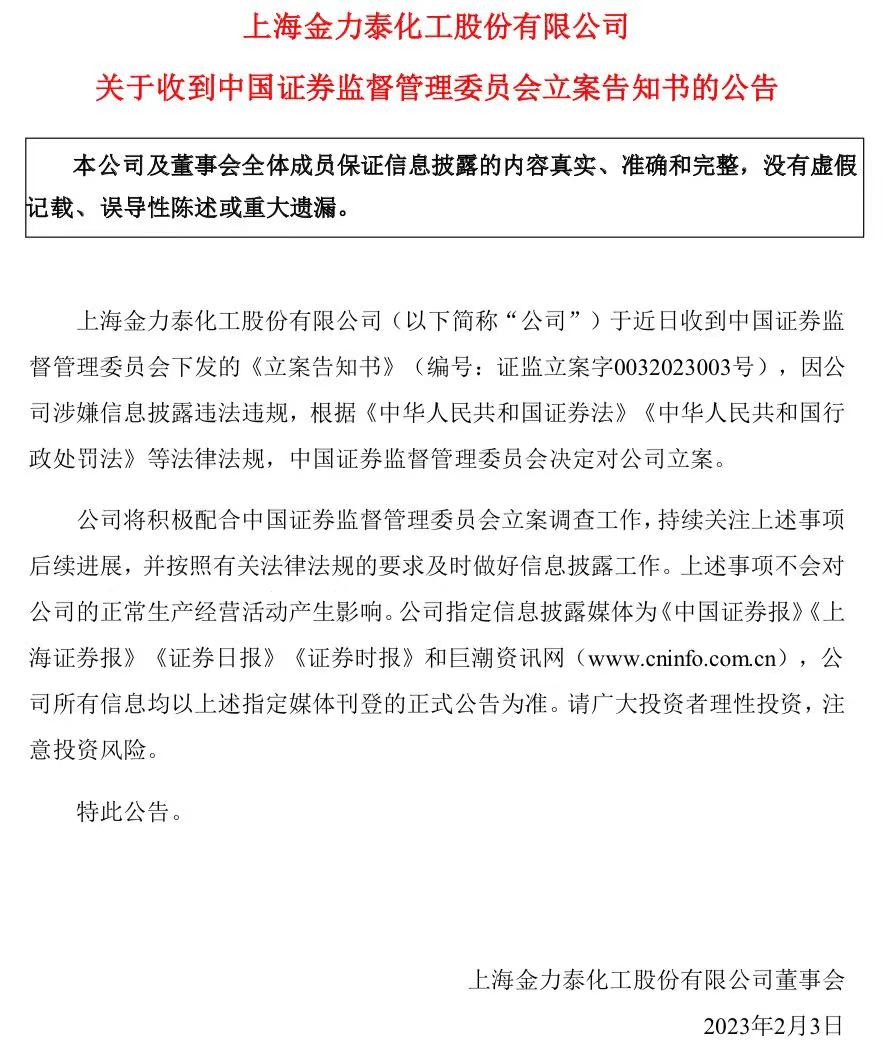 2月3日,因涉嫌信息披露违法违规,金力泰近日又收到中国证券监督管理委员会(以下简称证监会)下发的《立案告知书》。被证监会立案调查,根据《证券法》及相关司法解释,凡2023年2月3日收盘时持有亏损的投资者均可参加索赔——这意味着证监会已经锁定金力泰的违规线索。
