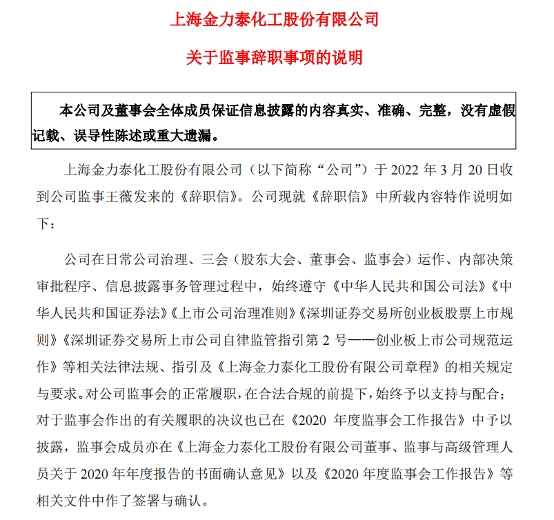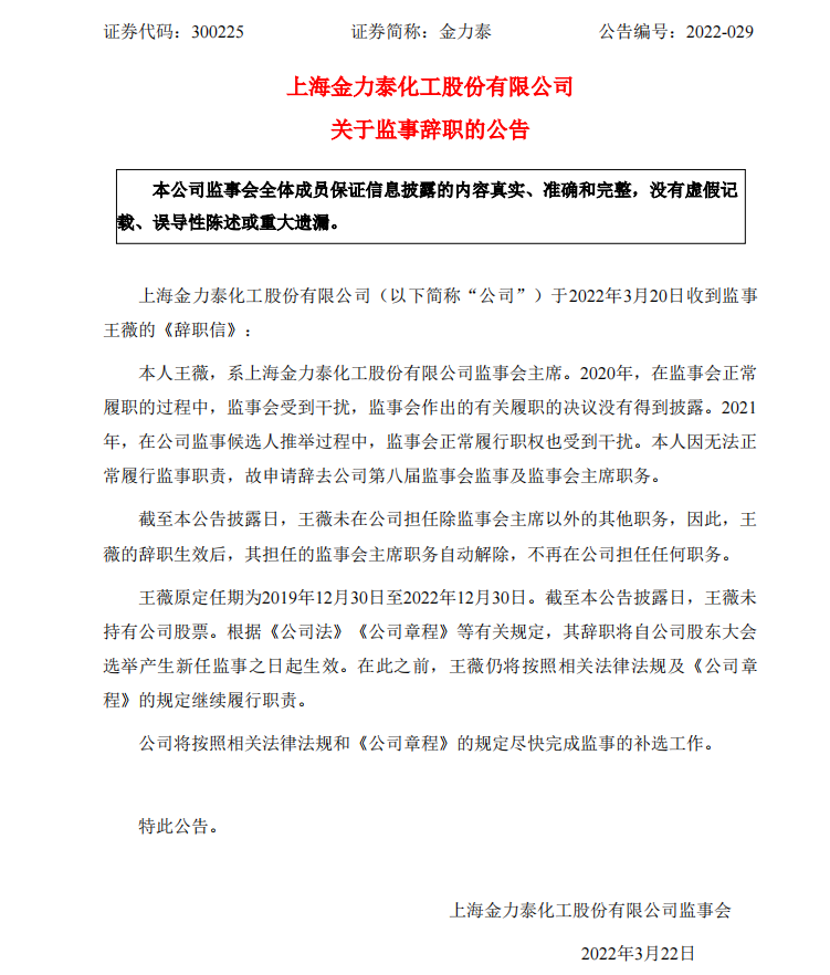 王薇在《辞职信》中说:本人王薇,系上海金力泰化工股份有限公司监事会主席。2020年,在监事会正常履职的过程中,监事会受到干扰,监事会作出的有关履职的决议没有得到披露。2021年,在公司监事候选人推举过程中,监事会正常履行职权也受到干扰。本人因无法正常履行监事职责,故申请辞去公司第八届监事会监事及监事会主席职务。