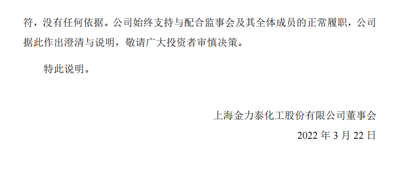 2022年4月12日晚间金力泰公告回复深交所关注函,金力泰称,公司管理层不存在拒绝配合监事会履职、干扰监事会正常履职的情况,公司日常生产与经营有序开展中,公司不存在生产经营发生重大不利变化的情形。