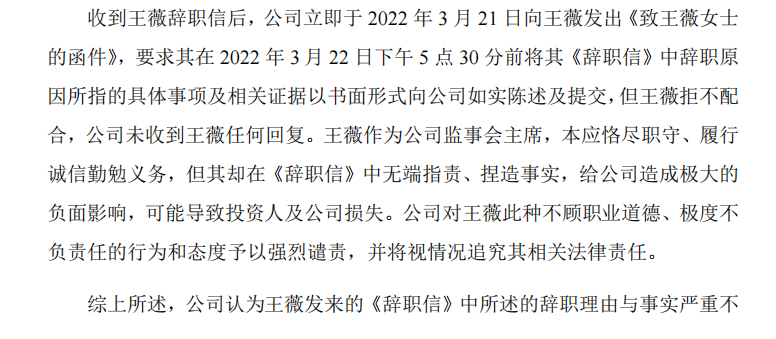 金力泰表示,王薇作为公司监事会主席,本应恪尽职守、履行诚信勤勉义务,但其却在《辞职信》中无端指责、捏造事实,给公司造成极大的负面影响,可能导致投资人及公司损失。公司对王薇此种不顾职业道德、极度不负责任的行为和态度予以强烈谴责,并将视情况追究其相关法律责任。