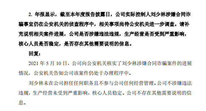 在2021年5月12日张岚因年报未签名回复证券所问询的公告中,证券所第二个问题是刘少林涉嫌合同诈骗事宜进展情况的问询。