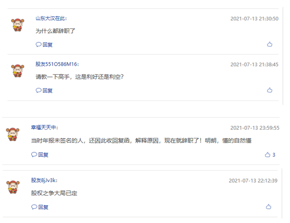 张岚是引咎辞职,还是涉嫌被卷入股权之争,让人难免猜测。在金力泰股吧里,有网民诧异地问:“为什么都辞职了?”有网民称,“当时年报未签名的人,还因此收回复函,解释原因,现在就辞职了!明朗,懂的自然懂”,也有网民评论称:股权之争,大局已定。