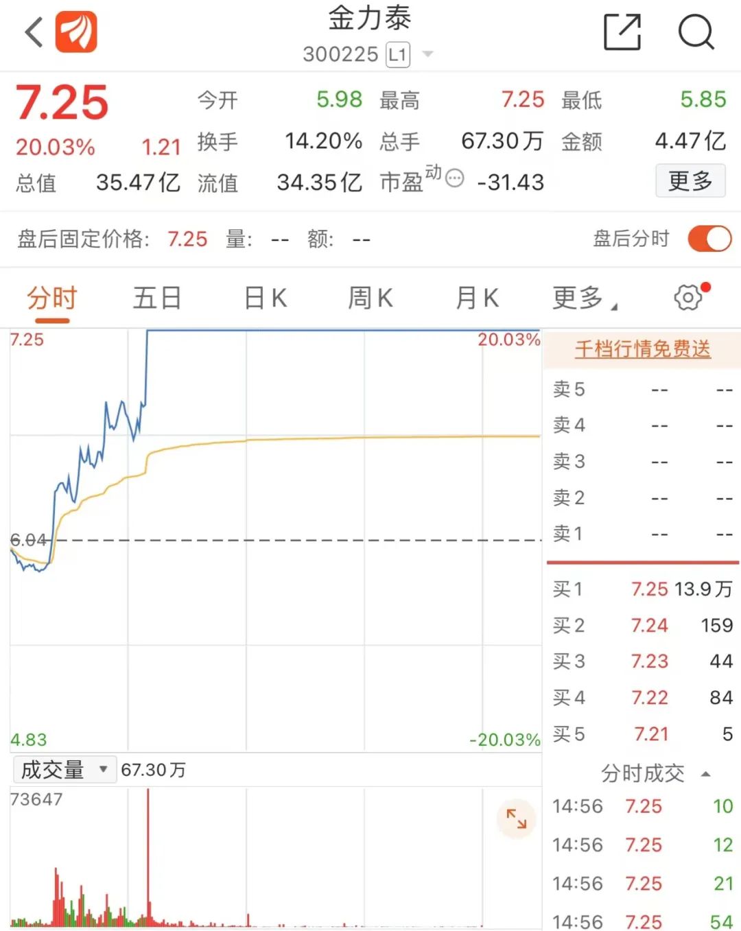 今日,作为汽车涂料行业龙头的金力泰(300225)收获一个涨停。截至今日收盘,金力泰报7.25元,涨幅20.03%;成交量66.87万,成交额4.437亿;换手率14.12%,市盈率(动)-31.43倍。根据最新收盘价计算,金力泰总市值为35.47亿。