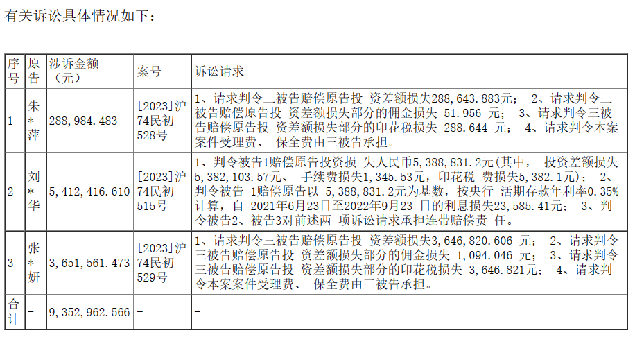 公告显示,该案由是证券虚假陈述责任纠纷,诉讼金额共计人民币9,352,962.566元。诉讼请求主要是请求判令三被告赔偿原告投资差额损失,请求判令三被告赔偿原告投资差额损失部分的佣金损失、请求判令三被告赔偿原告投资差额损失部分的印花税损失、请求判令本案案件受理费、保全费由三被告承担以及利息损失。