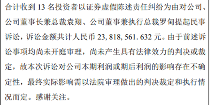金力泰表示,截至6月6日《关于投资者诉讼事项的公告》(公告编号:2023-038)披露日,公司合计收到13名投资者以证券虚假陈述责任纠纷为由对公司、公司董事长兼总裁袁翔、公司董事兼执行总裁罗甸提起民事诉讼,诉讼金额共计人民币 23,818,561.632 元。由于前述诉讼事项均尚未开庭审理,尚未产生具有法律效力的判决或裁定,故本次诉讼对公司本期利润或期后利润的影响存在不确定性,最终实际影响需以法院审理做出的判决裁定和执行情况而定。