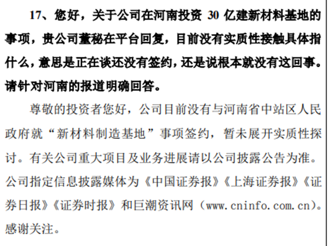 有投资者提问:关于公司在河南投资30亿建新材料基地的事项,贵公司董秘在平台回复,目前没有实质性接触具体指什么,意思是正在谈还没有签约,还是说根本就没有这回事。