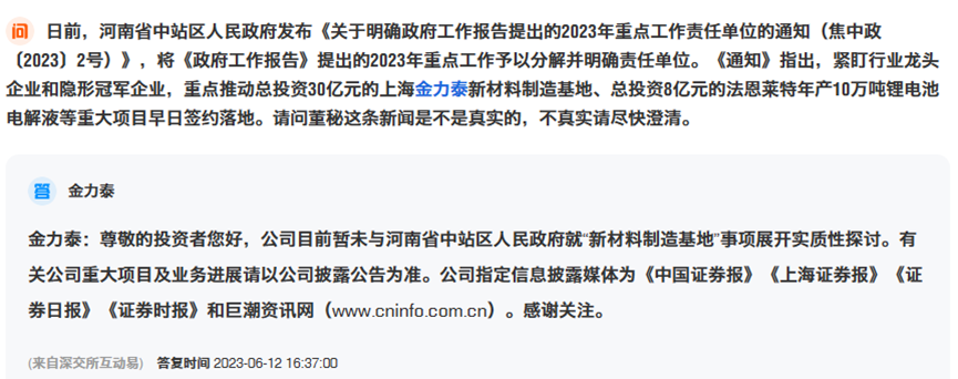 2023年3月11日,河南省地级市党报《焦作日报》A07版刊发《目标明确路径清晰 2023,中站区这么干 2023年经济社会发展主要预期目标》,在这份以2023年度焦作市中站区政府工作报告为主要内容的报道中,“紧盯行业龙头企业和隐形冠军企业,重点推动总投资30亿元的上海金力泰新材料制造基地、总投资8亿元的法恩莱特年产10万吨锂电池电解液等重大项目早日签约落地。”引发涂料行业人士的广泛关注,有人为金力泰究竟有无这项投资计划打上了重重的问号。
