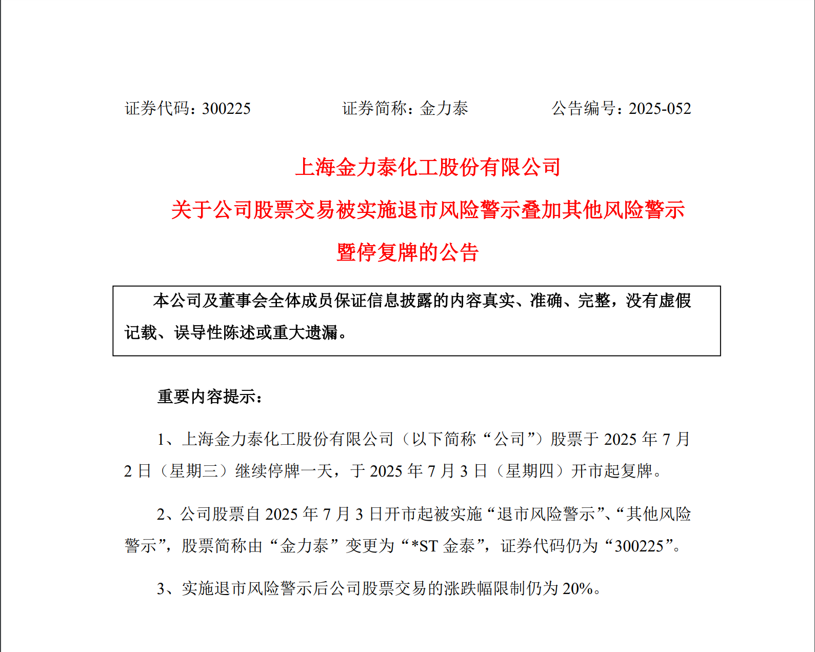 不过,金力泰因2024年度财务报表被出具“无法表示意见”审计报告,叠加2024年度内部控制被出具“否定意见”审计报告,公司股票“披星戴帽”。7月3日复盘后,公司股票简称变为*ST金泰。