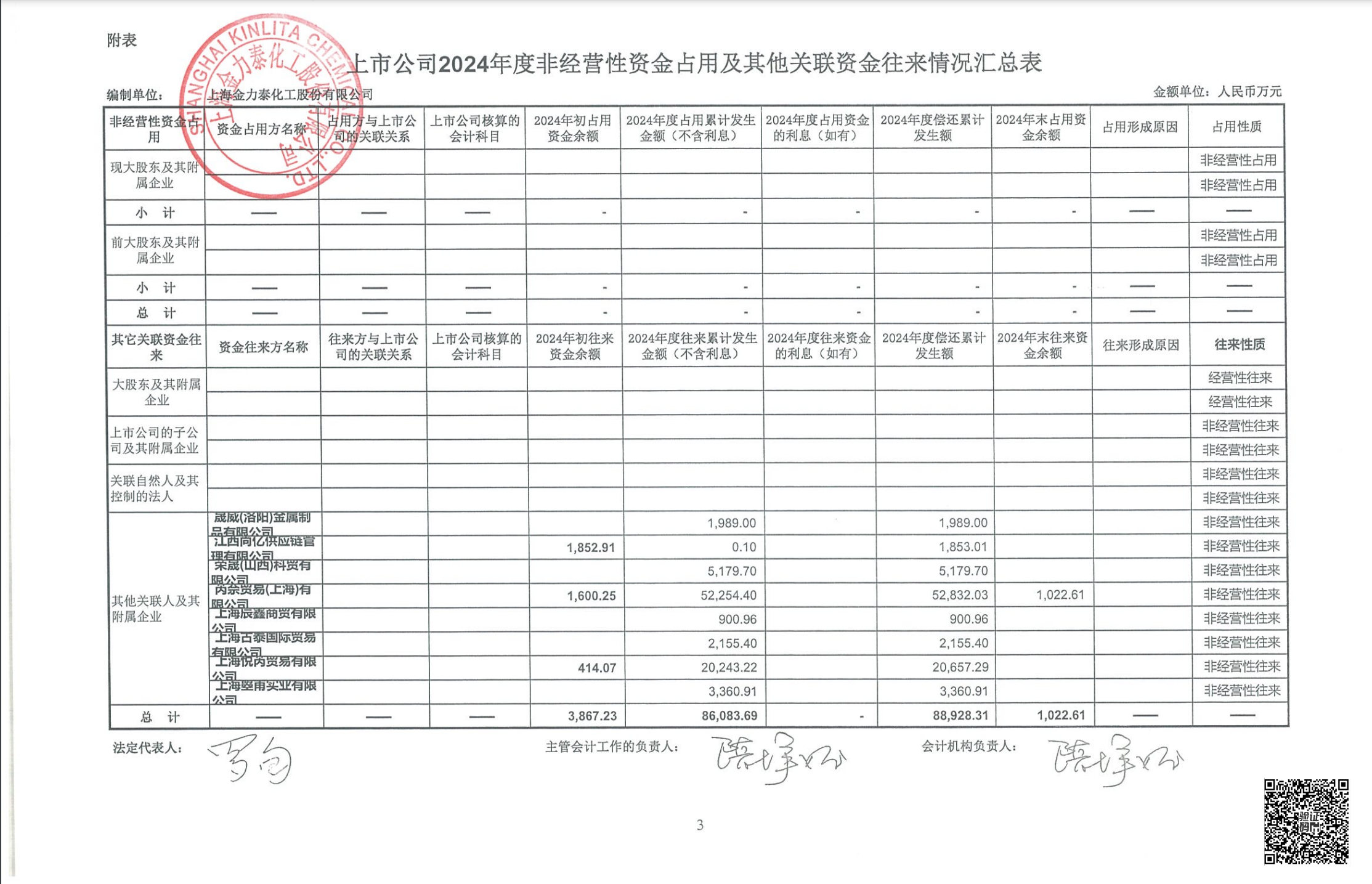 2024年金力泰向相关贸易商转出资金累计9.31亿元,累计转回9.30亿元。相关贸易商预付款项2024年末余额0.18亿元,年初余额0.66亿元。