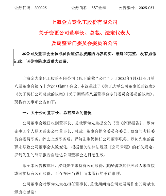 铁打的金力泰变更为“*ST金泰”,流水的董事长再次出现了变动。