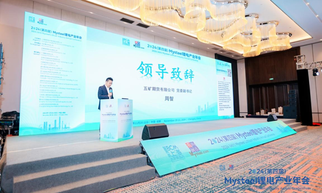 2024年11月20-22日,由上海钢联电子商务股份有限公司(我的钢铁网)主办、五矿期货有限公司(下称“五矿期货”)协办的“2024(第四届)Mysteel锂电产业年会”在成都武侯渝江皇冠假日酒店隆重举行。本次会议围绕宏观经济走势、全球ESG发展情况、锂电产业发展分析、电池金属原料行情研讨、新材料新技术专题、阿根廷盐湖投资专题、全球锂矿供需对接会等多个主题展开,旨在共同展望2025年,提前进行投资布局。五矿期货通过搭建展台、举办同期会议等形式进行品牌宣传和业务拓展,公司党委副书记、副总经理周智出席会议并致辞。