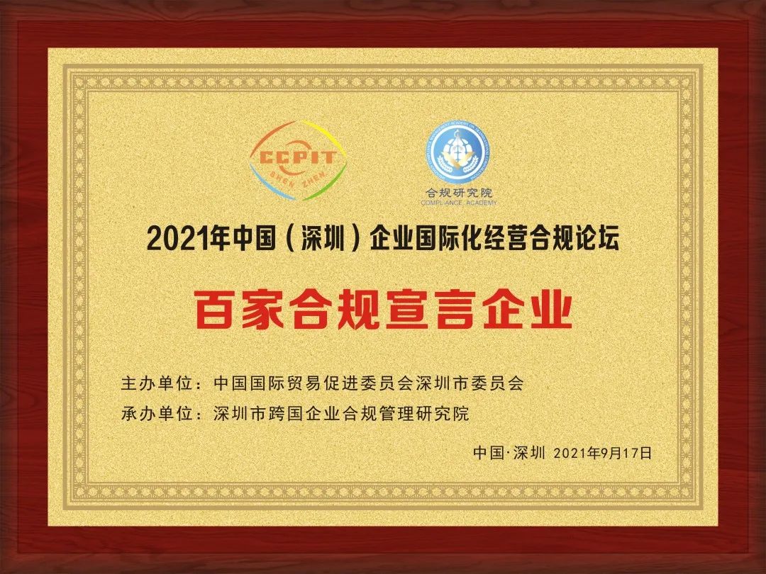 光韵达在2021年中国(深圳)企业国际化经营合规论坛”荣获《百家合规宣言企业》荣誉牌