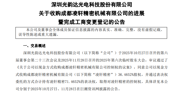 本次收购分为两步:首先以2.41亿元现金取得凌轩精密36.4652%股权,同时与原控股股东韩东签署协议,获得其持有的剩余35%股权的全部表决权。这一安排使光韵达以相对较小的直接股权投入(36.47%),实现了对标的公司71.47%表决权的控制,展现出精妙的交易结构设计。