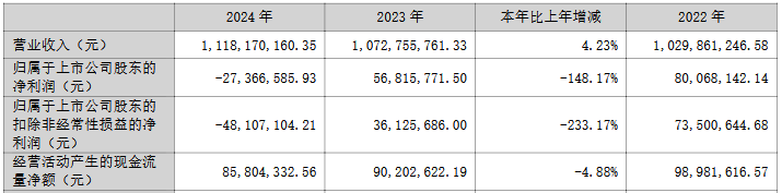 2024年,公司实现营业收入11.18亿元,同比增长4.23%;归属于上市公司股东的净利润为-2,736.66万元,上年同期为5,681.58万元;归属于上市公司股东的扣除非经常性损益的净利润为-4,810.71万元,上年同期为3,612.57万元;经营活动产生的现金流量净额为8,580.43万元,同比下降4.88%。