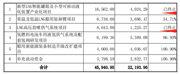 《延期公告》显示,截至目前,该次定增的募投项目中,只完成了“船用新能源装备制造升级改扩建项目”及“补充流动资金”;所有项目累计投入金额仅2.22亿元。而“新型LNG智能罐箱及小型可移动液化装置产业化项目”、“LNG高压直喷供气系统项目”均已终止。