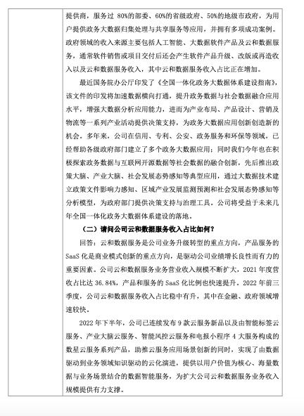 2022年下半年,公司已连续发布9款云服务新品以及由智能标签云服务、产业大脑云服务、智能风控云服务和电报小程序4大服务构成的数星云服务系列产品,助推云服务应用场景创新的同时,实现了由数据驱动到业务领域知识驱动的云化演进,提供以用户价值为核心、海量数据与业务场景结合的数据智能服务,为扩大公司云和数据服务业务收入规模提供有力支撑。