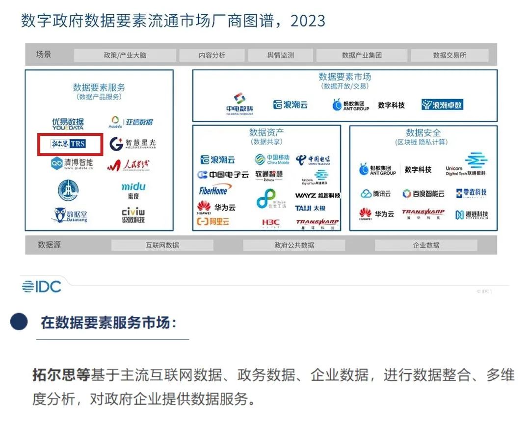 4月11日,知名科技市场研究机构IDC正式发布《数字政府数据要素流通市场分析》报告。拓尔思信息技术股份有限公司作为数字政务建设领域的头部企业,入选IDC绘制的“数字政府数据要素流通市场厂商图谱,2023”中数据要素服务细分市场代表厂商,同时公司承建的营口自贸区主导产业态势感知系统案例作为典型实践案例被收录于报告中。
