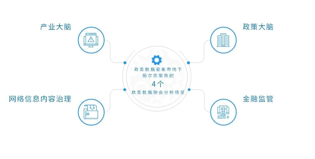 数字政府建设,首先要解决好数据资源的整合与应用问题。充分激活政务数据要素潜能,释放数据内在价值,有助于提高群众对政务服务的满意度。拓尔思深耕政府行业20余年,一直致力于数智融合的数字政府创新建设,并保持行业领先的市场地位。拓尔思政务数据产品面向政务数据融合分析,以服务场景为牵引而不断深入服务。公司政务数据供给场景主要聚焦在产业大脑、政策大脑、网络信息内容治理及金融监管四个方面。