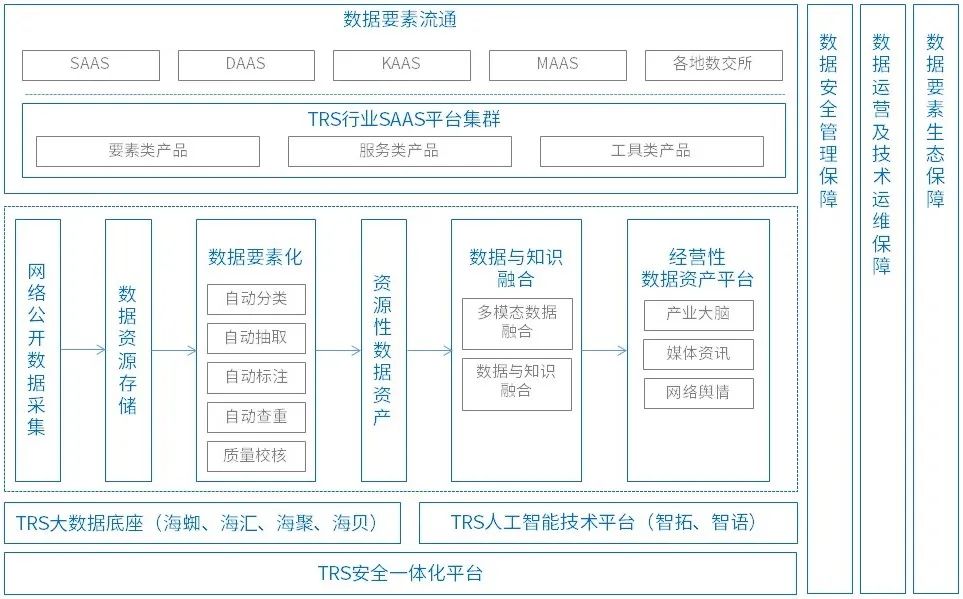 拓尔思作为领先的大数据、人工智能和数据安全产品及服务提供商,以完善自身数据要素资源体系、壮大数据要素应用体系及建立数据要素安全体系为发展目标,全面布局数据要素市场。公司拥有完整的大数据基础建设产品线、丰富的行业SaaS服务集群和可靠的安全一体化平台。
