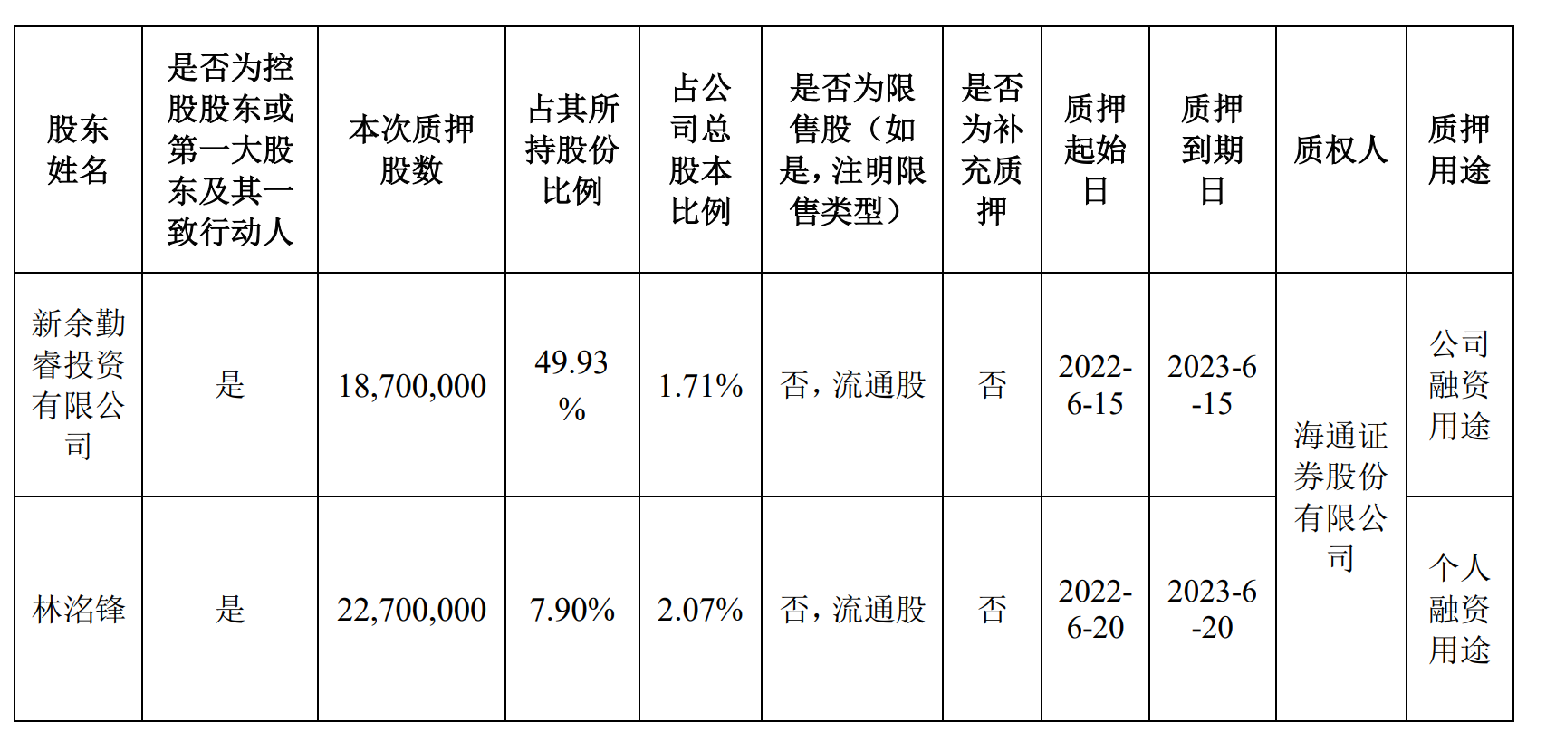 公告显示,新余勤睿投资有限公司将其直接持有的1870万股洲明科技股份质押给海通证券股份有限公司,占洲明科技总股本比例为1.71%。林洺锋将其直接持有的2270万股洲明科技股份质押给海通证券股份有限公司,占洲明科技总股本比例为2.07%。