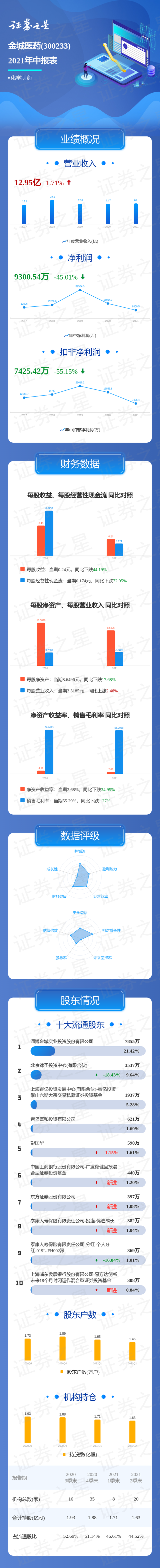 金城医药2021中报显示,公司主营收入12.95亿元,同比上升1.71%;归母净利润9300.54万元,同比下降45.01%;扣非净利润7425.42万元,同比下降55.15%;负债率32.52%,投资收益30.46万元,财务费用859.54万元,毛利率55.29%。