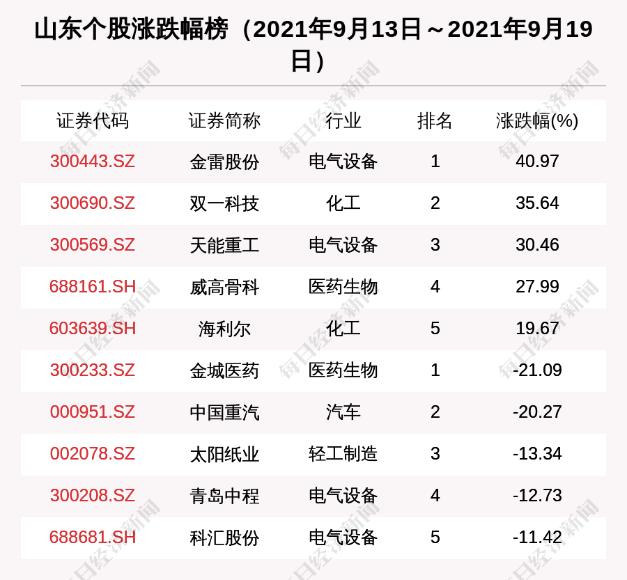 从涨跌幅来看,上周涨幅最大的山东公司是金雷股份,上涨幅度为40.97%。跌幅最大的是金城医药,下跌幅度为21.09%。