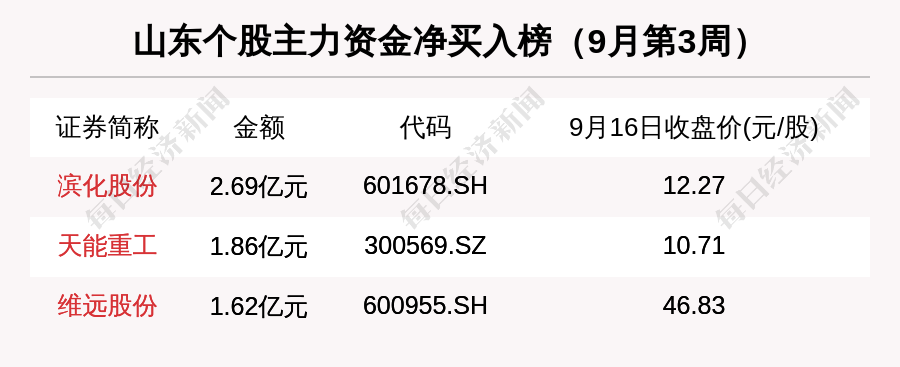 主力资金方面,9月第3周,滨化股份净买入额居首位,为2.69亿元,其次是天能重工(1.86亿元)和维远股份(1.62亿元)。