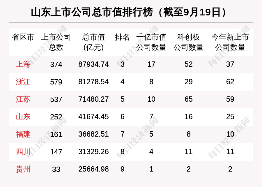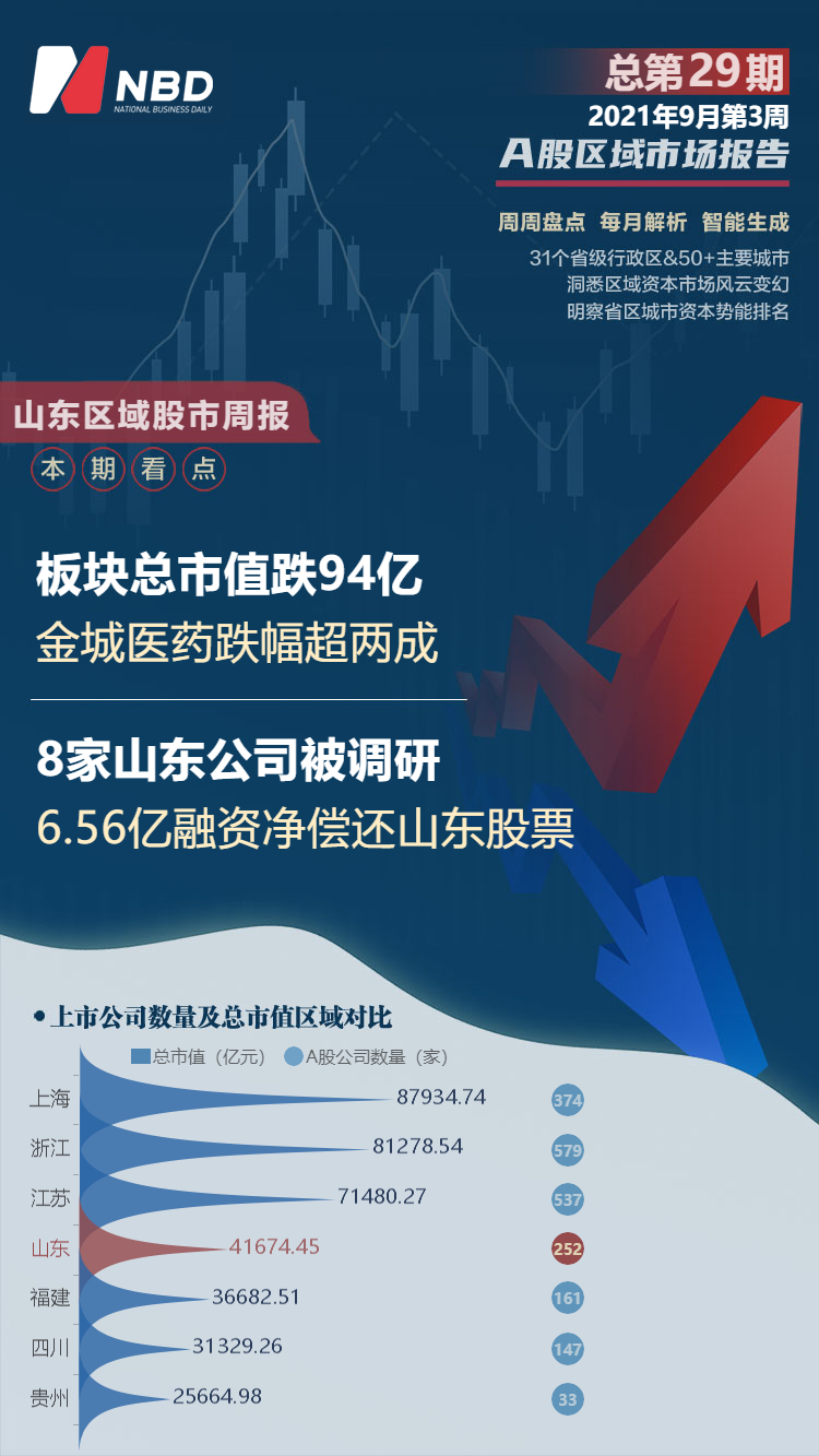 市值方面,截至2021年9月19日,山东板块总市值为41674.45亿元,较前一周41768.27亿元,缩水0.22%(加权平均)。