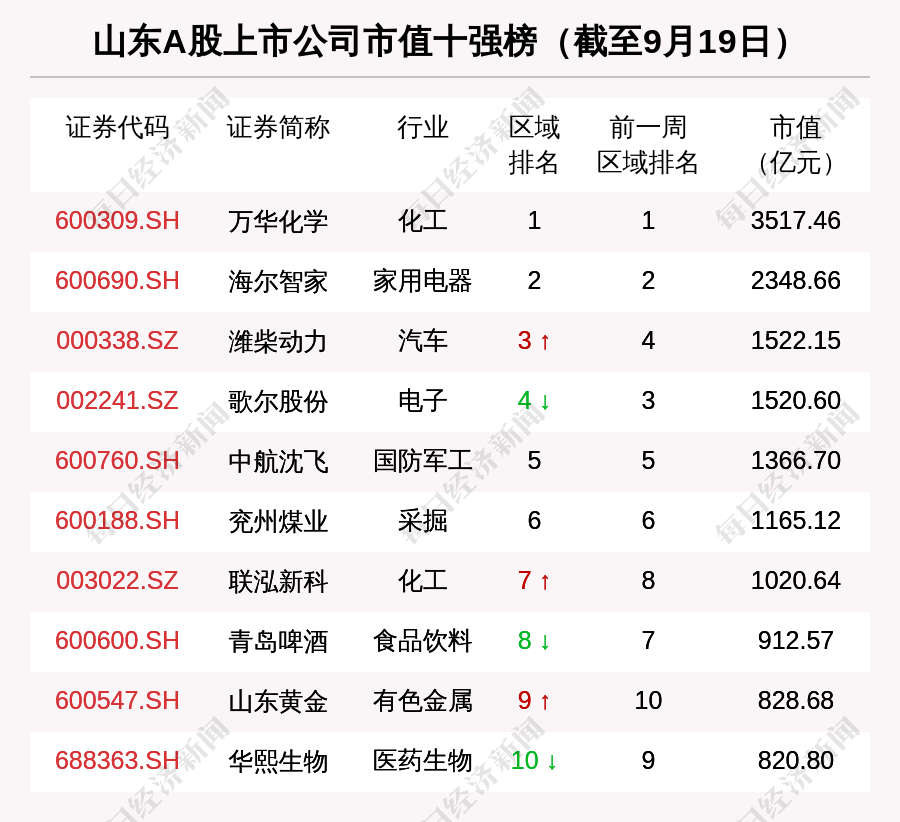 截至9月19日,山东板块市值最大的是万华化学,市值最小的是*ST金泰。上周市值增长最多的是万华化学,增长216.01亿元;市值缩水最多的是海尔智家,缩水136.42亿元。