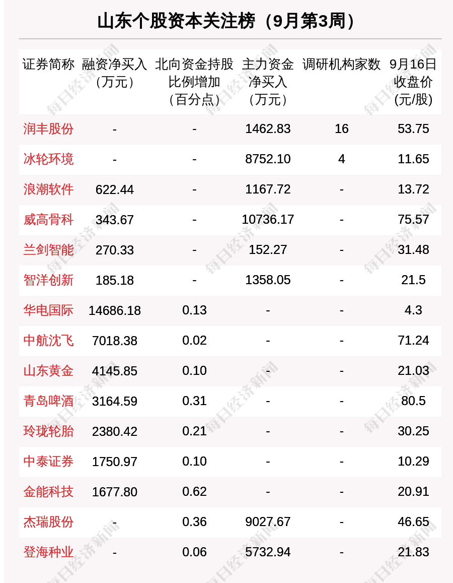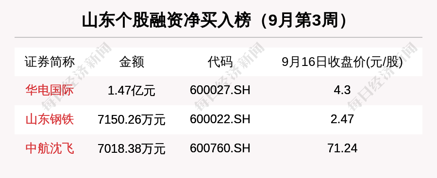 先看融资资金,9月第3周,山东板块融资净偿还总额为6.56亿元。融资净买入最多的山东股是华电国际,金额是1.47亿元。其次是山东钢铁(7150.26万元)和中航沈飞(7018.38万元)。