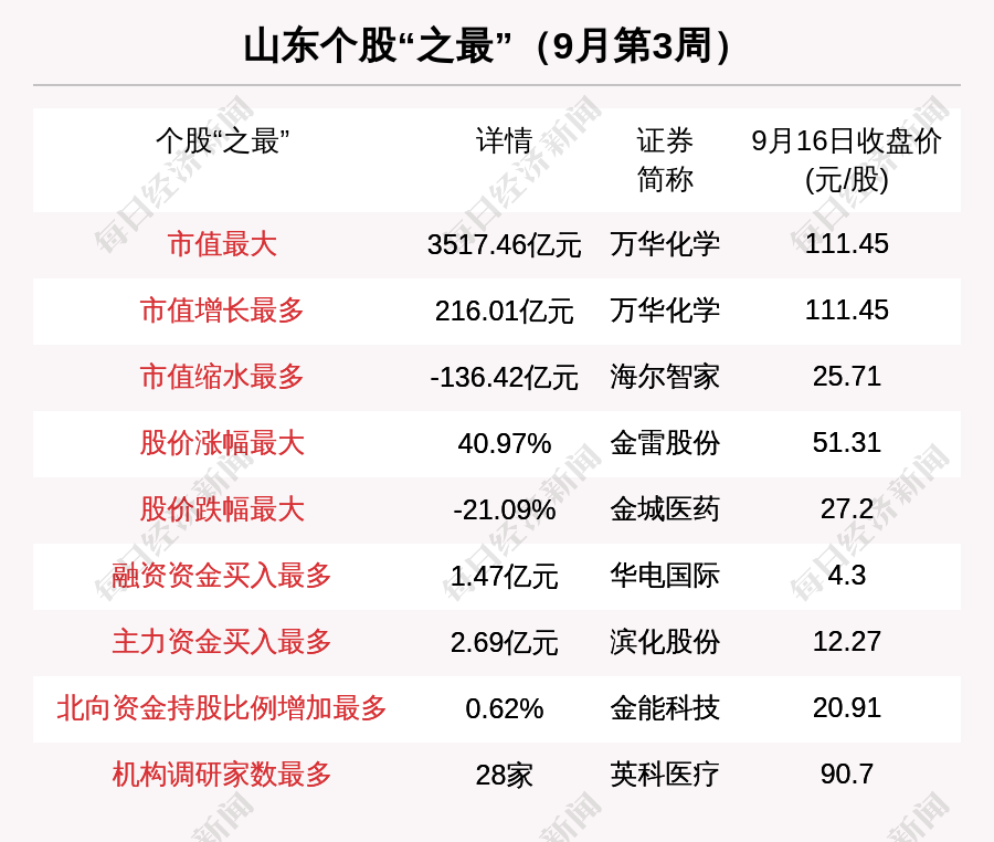 9月第3周(2021年9月13日~2021年9月19日),山东股中,万华化学市值增长最多;海尔智家市值缩水最多;涨幅最大的是金雷股份,上涨幅度为40.97%;跌幅最大的是金城医药。此外,润丰股份被16家机构调研,且被主力资金看好。