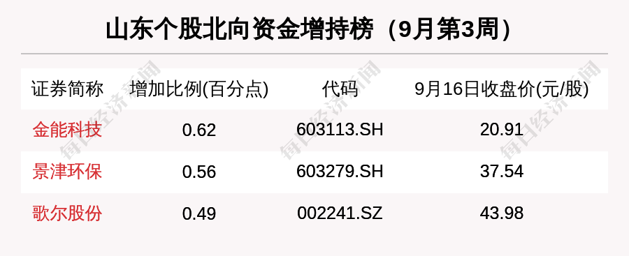 再看北向资金,9月第3周,金能科技北向资金持股比例增加0.62个百分点,景津环保北向资金持股比例增加0.56个百分点,歌尔股份北向资金持股比例增加0.49个百分点。