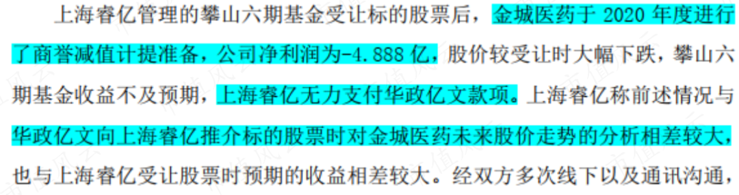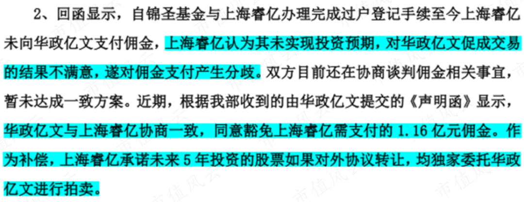 在上述数据的支持下,提前准备好的上海睿亿完全有机会取得很好的收益率。但根据上市公司的回复,由于上海睿亿对华政亿文促成交易的结果不满意,未实现预期投资收益,一直拒绝支付佣金。