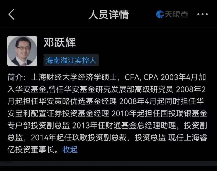 天眼查信息显示,上海睿亿的大股东、执行事务合伙人和董事长都是邓跃辉。