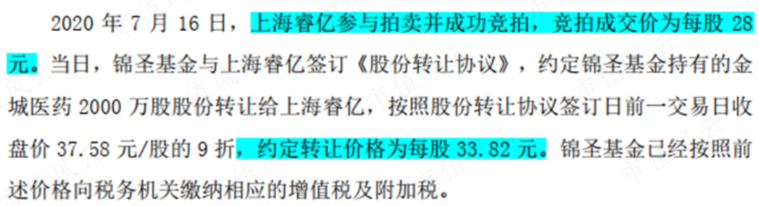 2020年7月,金城医药当时的第一大股东北京锦圣投资中心(有限合伙)(以下简称“锦圣基金”),将其持有的金城医药5.11%股权转让给上海睿亿投资发展中心(有限合伙)(以下简称“上海睿亿”),对外公告的转让价格为33.82元/股。