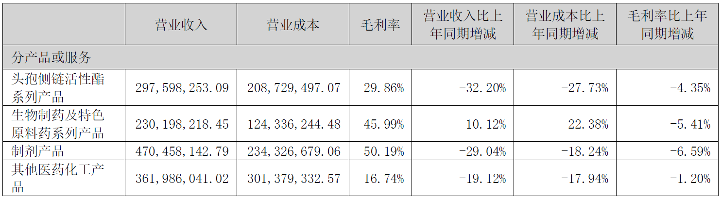 分产品看,曾作为“现金牛”的头孢侧链活性酯系列收入下滑32.20%,制剂产品收入下降29.04%,公司两大核心业务集体失速。而仅有新业务生物制药及特色原料药产品2.30亿元,同比增长10.12%,也难以挽救公司收入颓势。