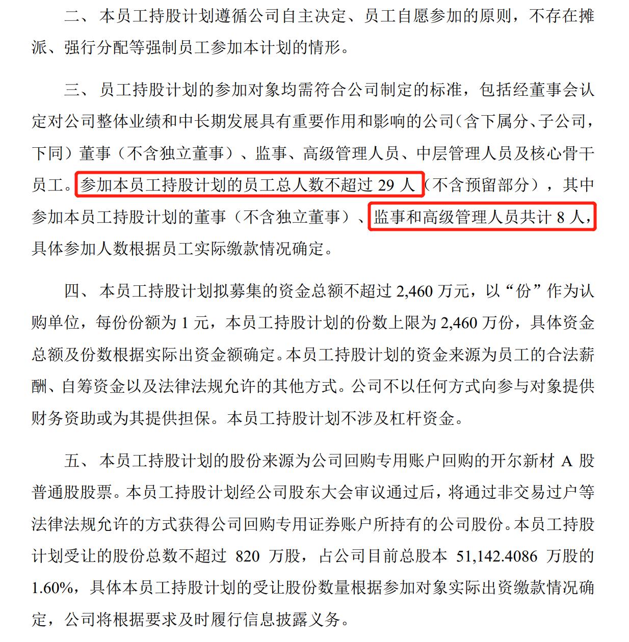 开尔新材曾表示,员工持股计划的参加对象均需符合公司制定的标准,包括经董事会认定对公司整体业绩和中长期发展具有重要作用和影响的公司董事(不含独立董事)、监事、高级管理人员、中层管理人员及核心骨干员工。