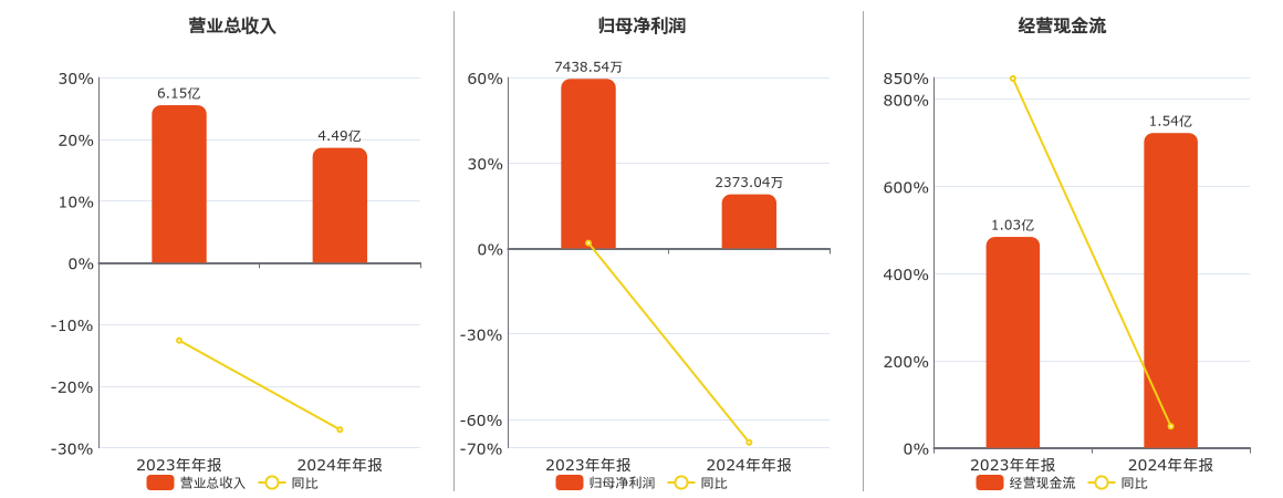 公司营业总收入为4.49亿元,较去年同报告期营业总收入减少1.66亿元,同比较去年同期下降27.05%。归母净利润为2373.04万元,较去年同报告期归母净利润减少5065.50万元,同比较去年同期下降68.10%。经营活动现金净流入为1.54亿元。