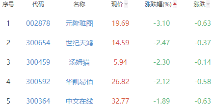元隆雅图、世纪天鸿、汤姆猫、华凯易佰和中文在线位列涨幅榜后五位,涨幅分别为-3.10%、-2.47%、-2.30%、-2.12%和-1.89%。