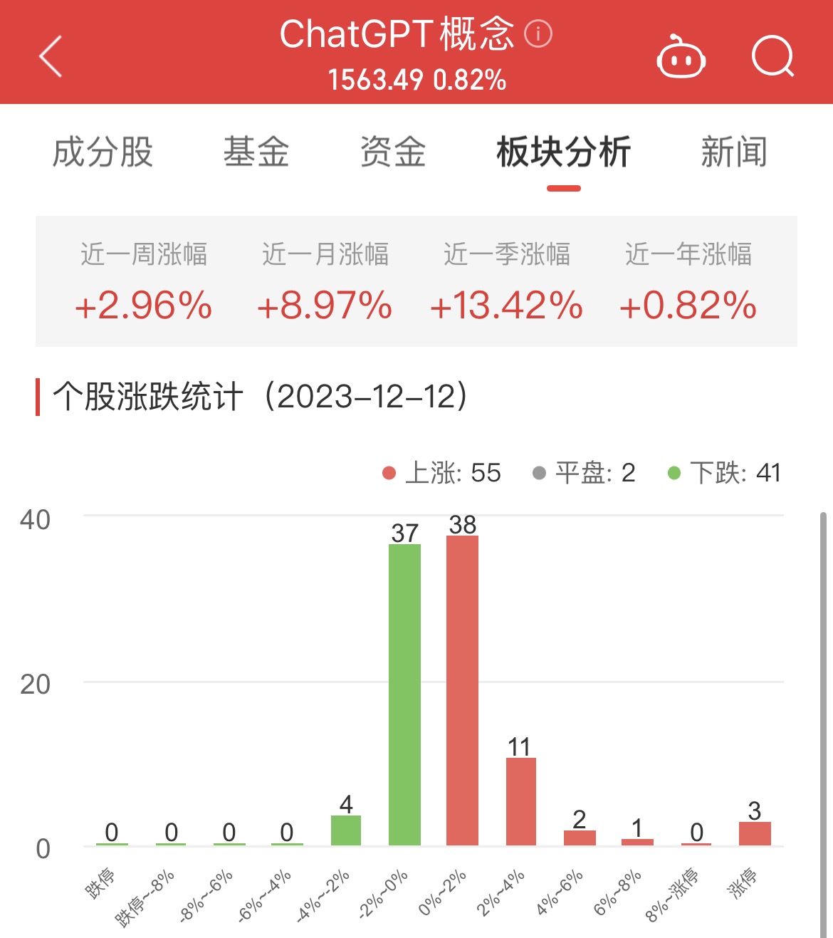 今日,ChatGPT概念板块整体涨幅0.82%,其中55只股票上涨,2只股票平盘,41只股票下跌。