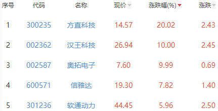 其中,方直科技、汉王科技、奥拓电子、信雅达和软通动力位列板块涨幅前五位,涨幅分别为20.02%、10.00%、9.99%、7.82%和5.96%。