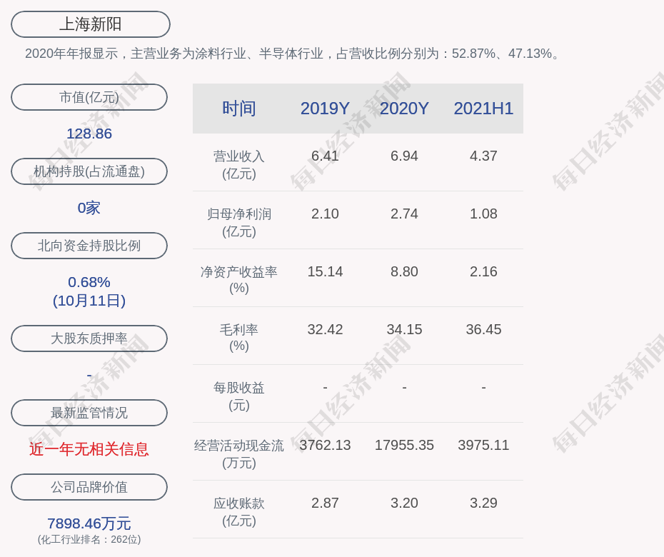 2020年年报显示,上海新阳的主营业务为涂料行业、半导体行业,占营收比例分别为:52.87%、47.13%。
