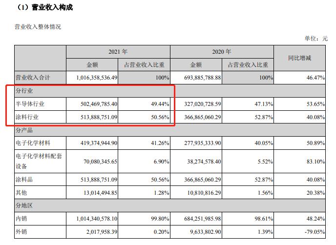 中新经纬注意到,上海新阳2021年年报显示,其营业收入构成为:涂料行业占比50.56%,半导体行业占比49.44%。