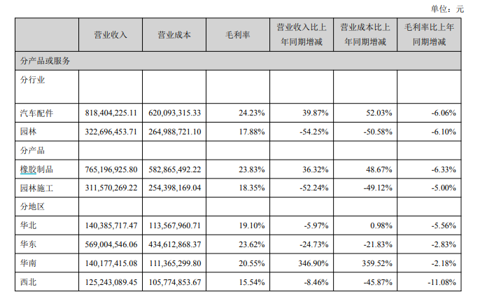 具体来看,美晨生态汽车配件业务,在今年上半年实现营业收入8.18亿元,同比增长39.87%,园林行业板块为上市公司带来3.23亿元的营业收入,却同比减少54.25%。