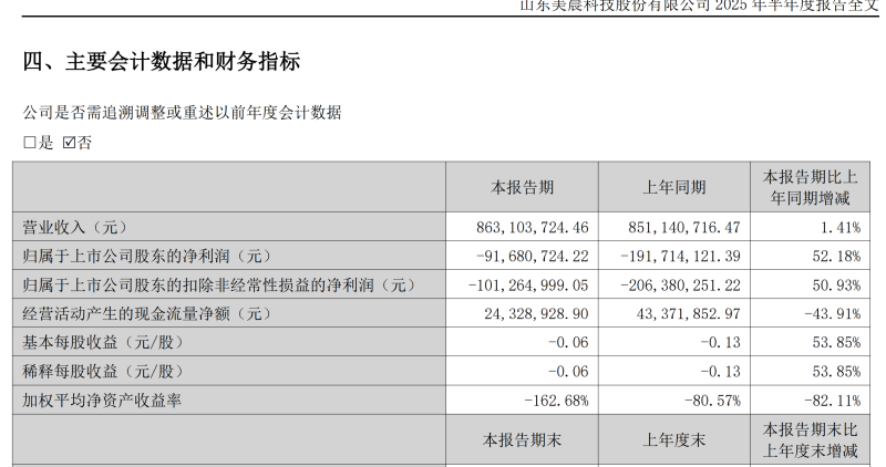 美晨科技主营业务包含非轮胎橡胶业务和园林绿化业务。2025年上半年,公司实现营业收入8.63亿元,同比增长1.41%;归属于上市公司股东的净利润-9168.07万元,同比增长52.18%。