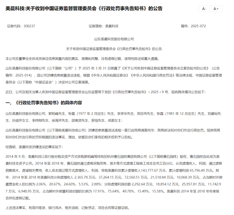 9月26日,美晨科技发布公告披露,公司收到行政处罚事先告知书。受此影响,美晨科技将于9月29日停牌一天,于9月30日起复牌并被实施其他风险警示,股票简称变更为“ST美晨”,涨跌幅仍为20%。