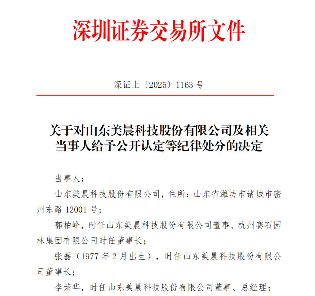 10月30日,深交所对山东美晨科技股份有限公司(以下简称“ST美晨”)及13名相关责任人作出纪律处分。